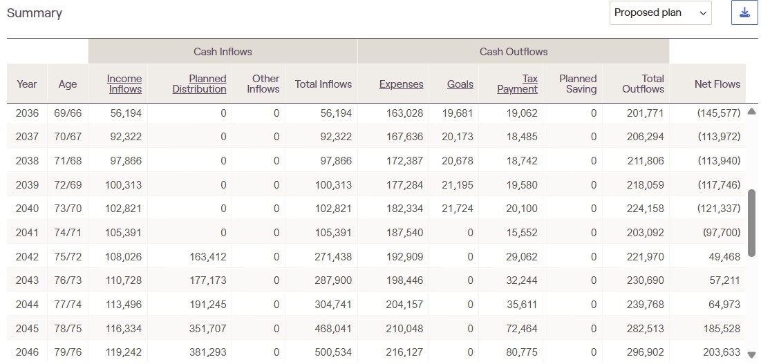 We're going to start pulling from their accounts to live off of and then we're going to have a little dip when we assume their Social Security is going to flip on at full retirement age 67 and age 70. So that's why we're not taking quite as much out of the accounts.