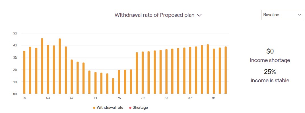 Let's take a quick look at their withdrawal rate. Now, even with these added expenditures and retiring a little bit early, they're still going to be in great shape as you probably could have guessed by their high probability of success and large amount of assets predicted at the end of plan.