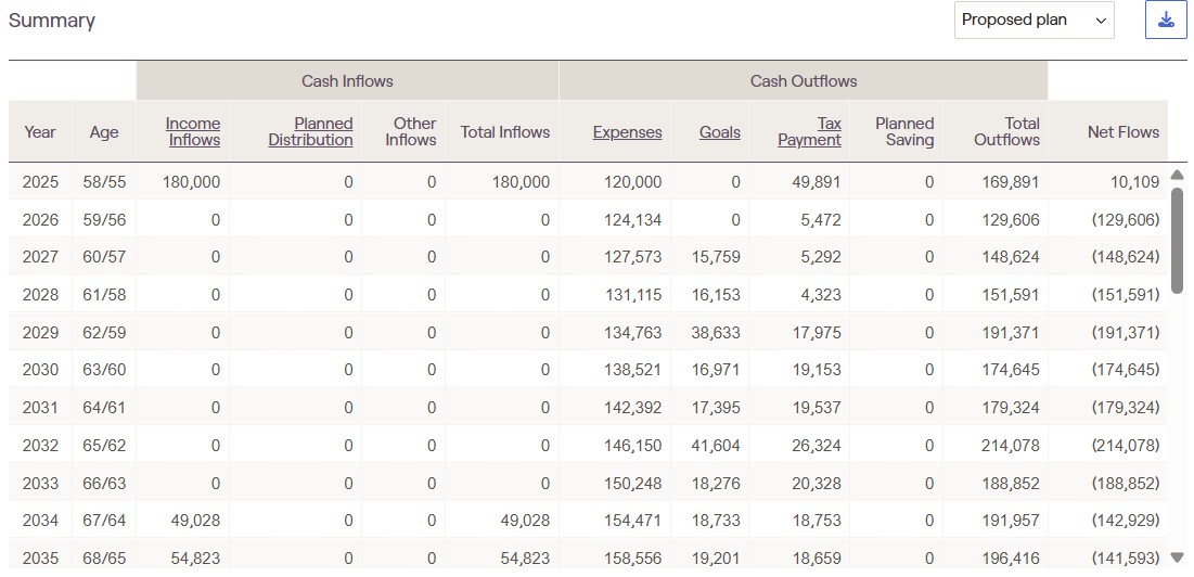 We have expenses starting at $120,000 (because they are currently spending $10,000/month pre-retirement). Then the 2nd year includes $9,000/month in expenses plus annual healthcare costs of $13,434. Each year the numbers are inflation adjusted.