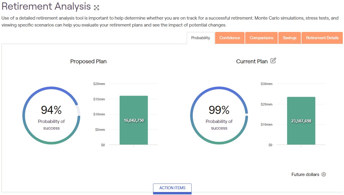 I don't want you to get hung up on the numbers. These Monte Carlo simulations are great, but they can get confusing. People think, if I'm not at 100%, does that mean my retirement is going to fail? Not at all. People can be at 50% and we start making changes, and small changes now can lead to big changes later, and that gets them from 50% up to maybe 70 or 80%.