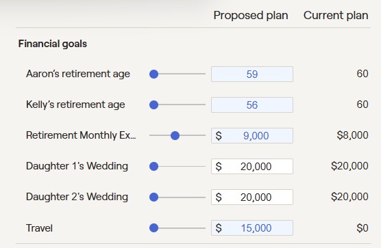 So if we take a look at their retirement situation, they are in very good shape on their expected goals and spending. This includes the $20,000 for the daughters' weddings, and it includes their expected expenditures, but it does not include the travel yet.