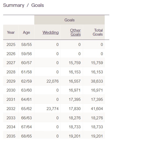 The weddings at that time, if I assume age 30 for both daughters, we see about $22,000 in 2029 for Daughter 1 and almost $24,000 in 2032 for Daughter 2.